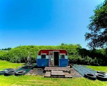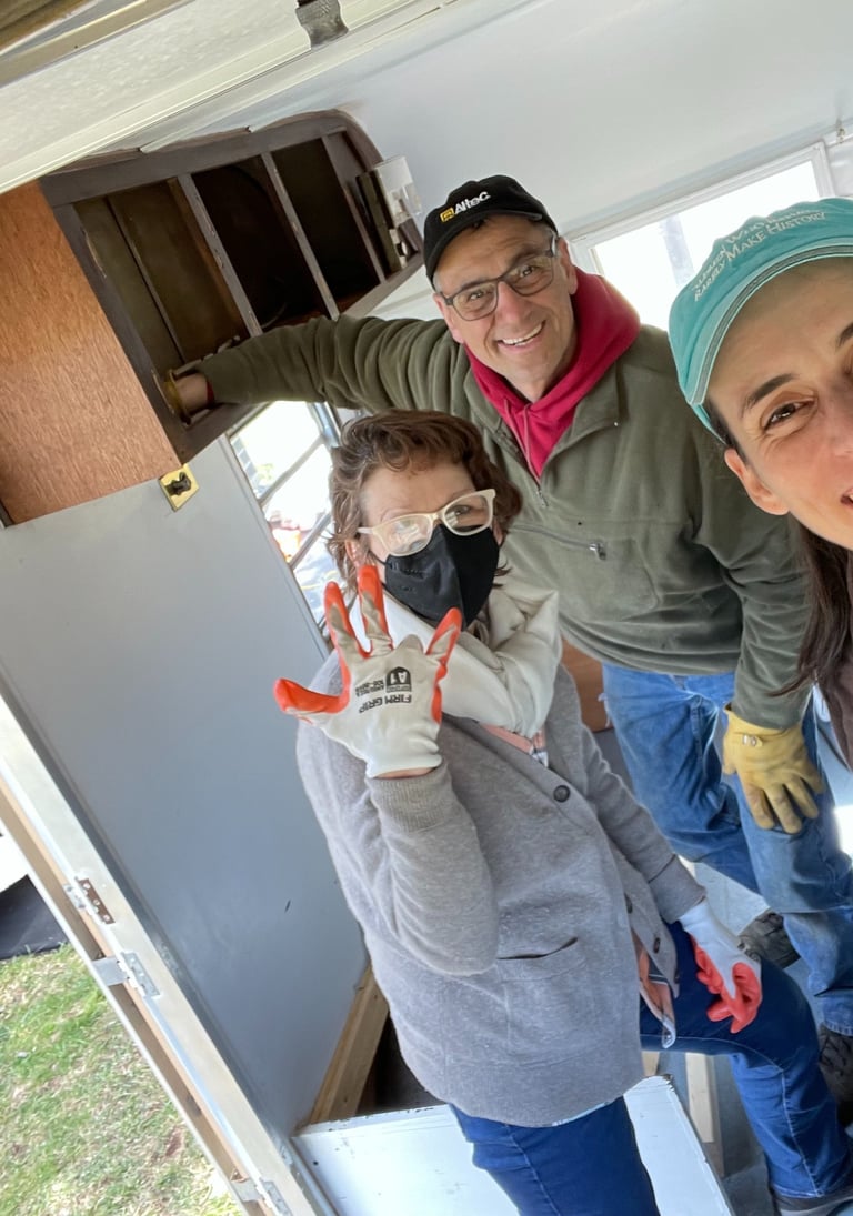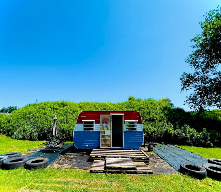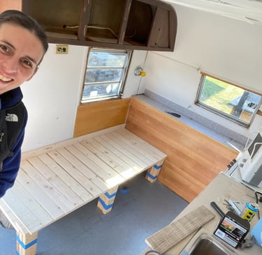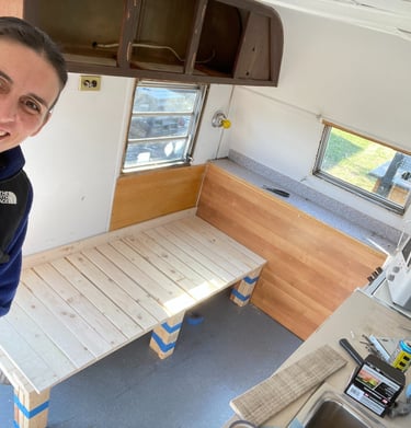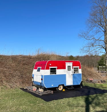 Once a well-traveled camper, Ms FROLIC now being thoughtfully upcycled—preserving her original character while reimagining the space with comfort, warmth, and hospitality in mind. Every update and design choice balances function with personality, creating a cozy, welcoming retreat.